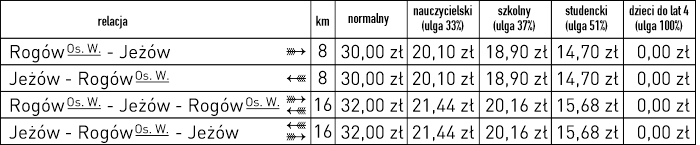 W pociągach naszej kolei obowiązuje pełen zakres ulg ustawowych, analogicznie jak u pozostałych przewoźników kolejowych (w tym dla posiadaczy Karty Dużej Rodziny i innych). Szczegółowe informacje o cenach dla poszczególnych odległości taryfowych oraz o obowiązujących ulgach ustawowych znajdziesz w dokumentach: